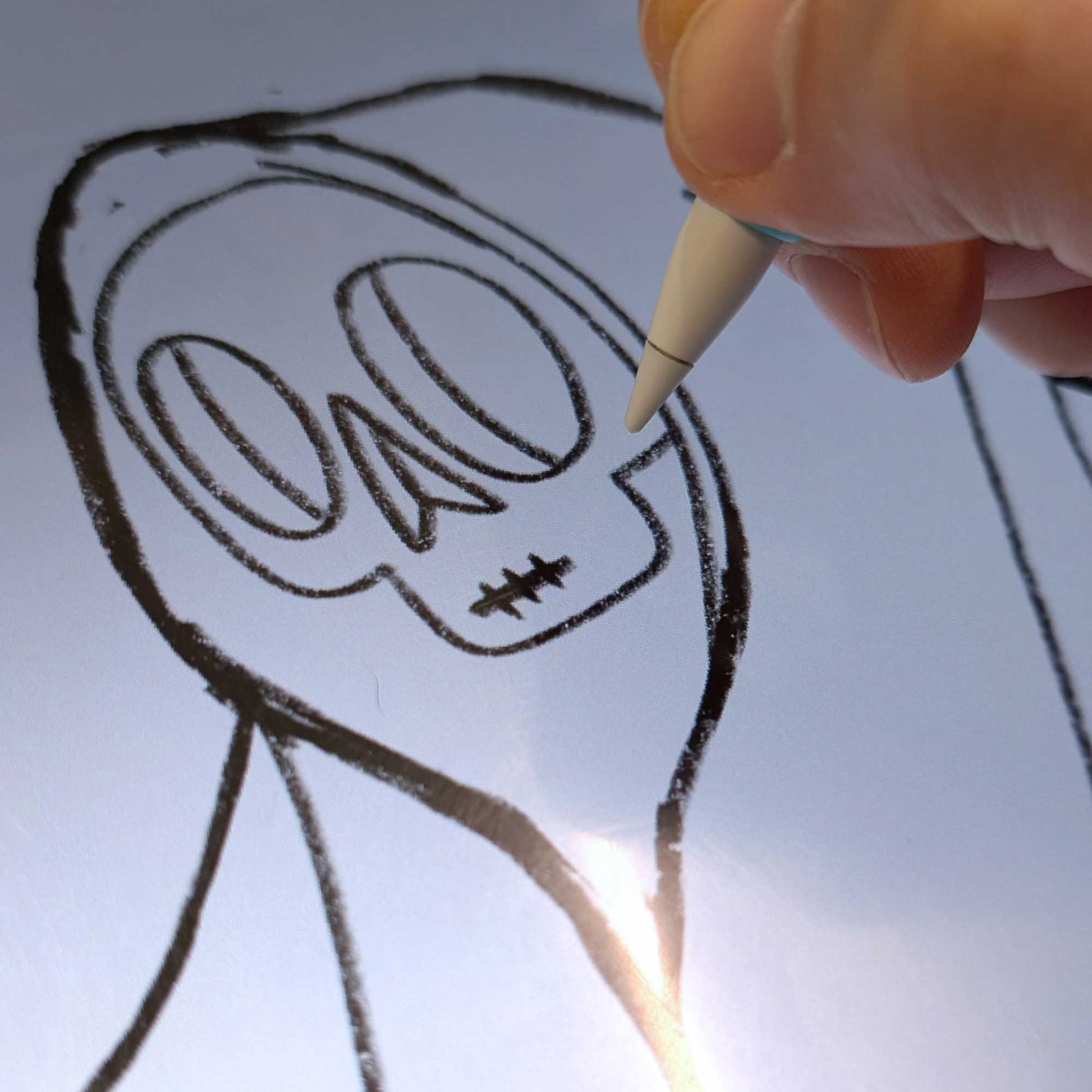 The Grim Reaper takes a surprising moment of respite in this distinctive hand-drawn print. Captured mid-task, Death carefully pauses his eternal duties to ensure a small Christmas tree receives the perfect finishing touch—the topper. It’s a snapshot of an unexpected moment, suggesting even mortality’s embodiment can be moved by a little seasonal care.