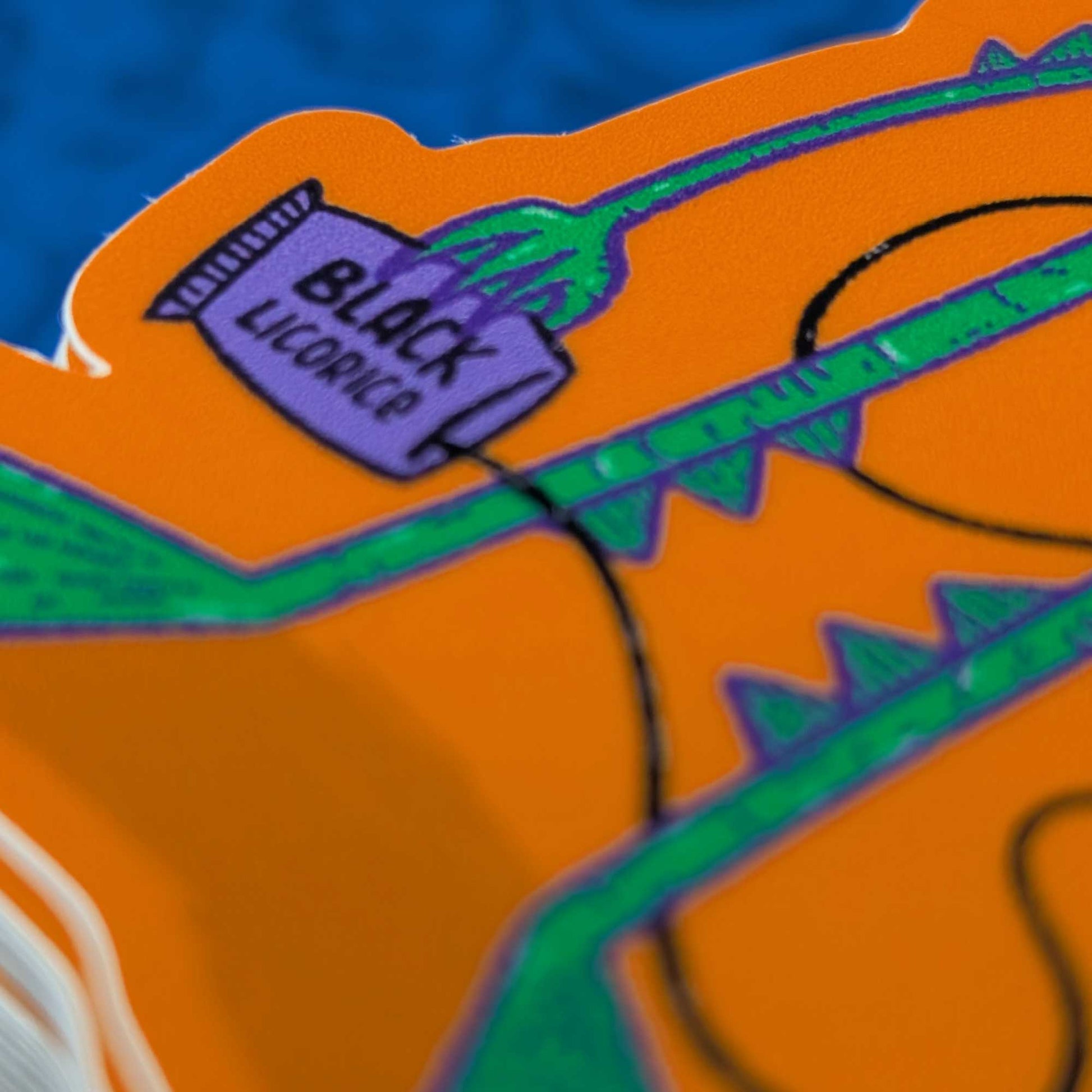 - Design: A custom, hand-drawn, and very happy green Larry the Gill-Man, savoring his favorite snack, black rope licorice. It's a fun, unique take on the classic Universal Monster with a personal touch.