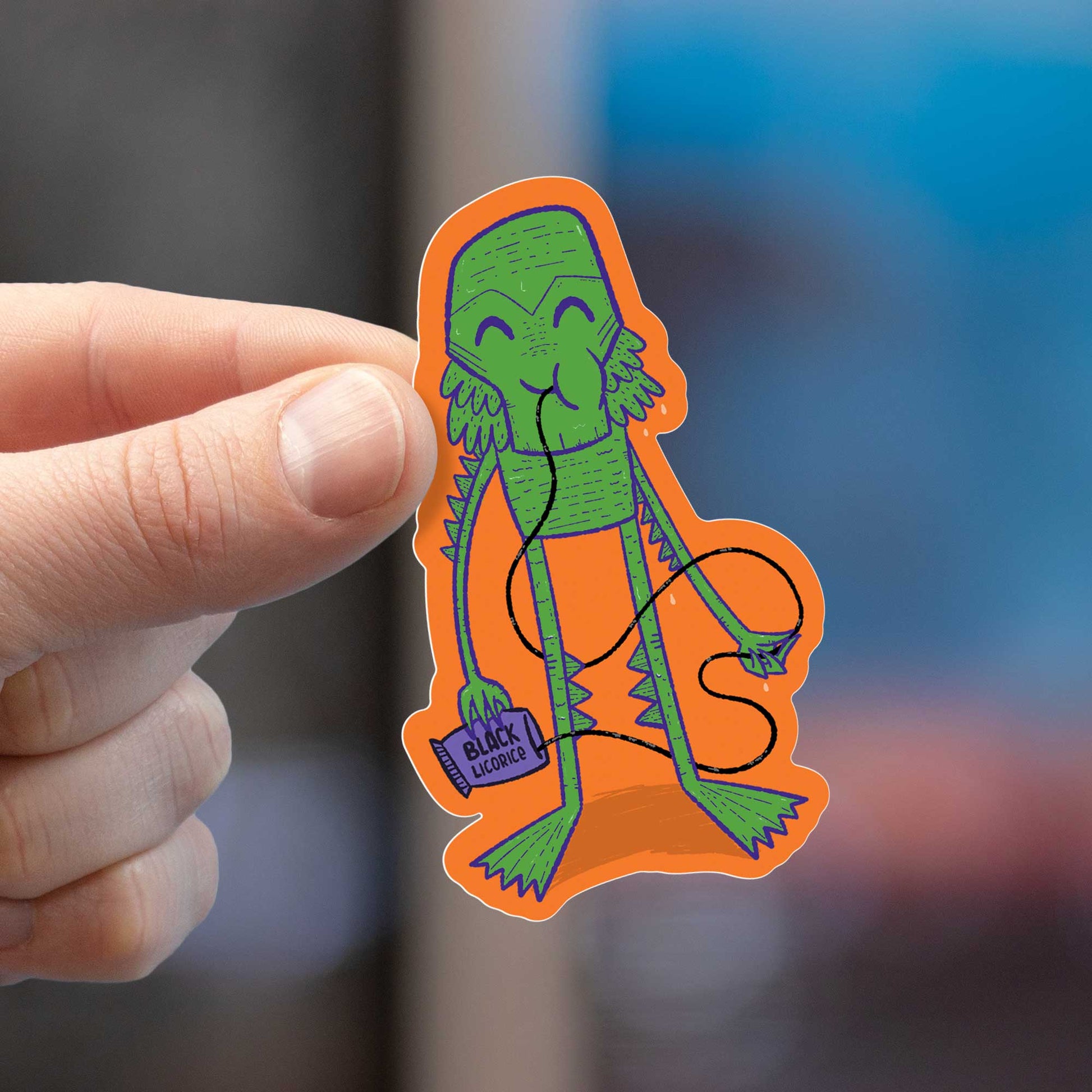 Get ready for some happy horror! This hand-drawn sticker features the one and only Gill-Man, now known as Larry! Forget the terrifying monster—this Larry is all smiles as he happily enjoys a long, satisfying piece of black rope licorice (because Larry likes licorice!). He's a delightfully unexpected moment of bliss.