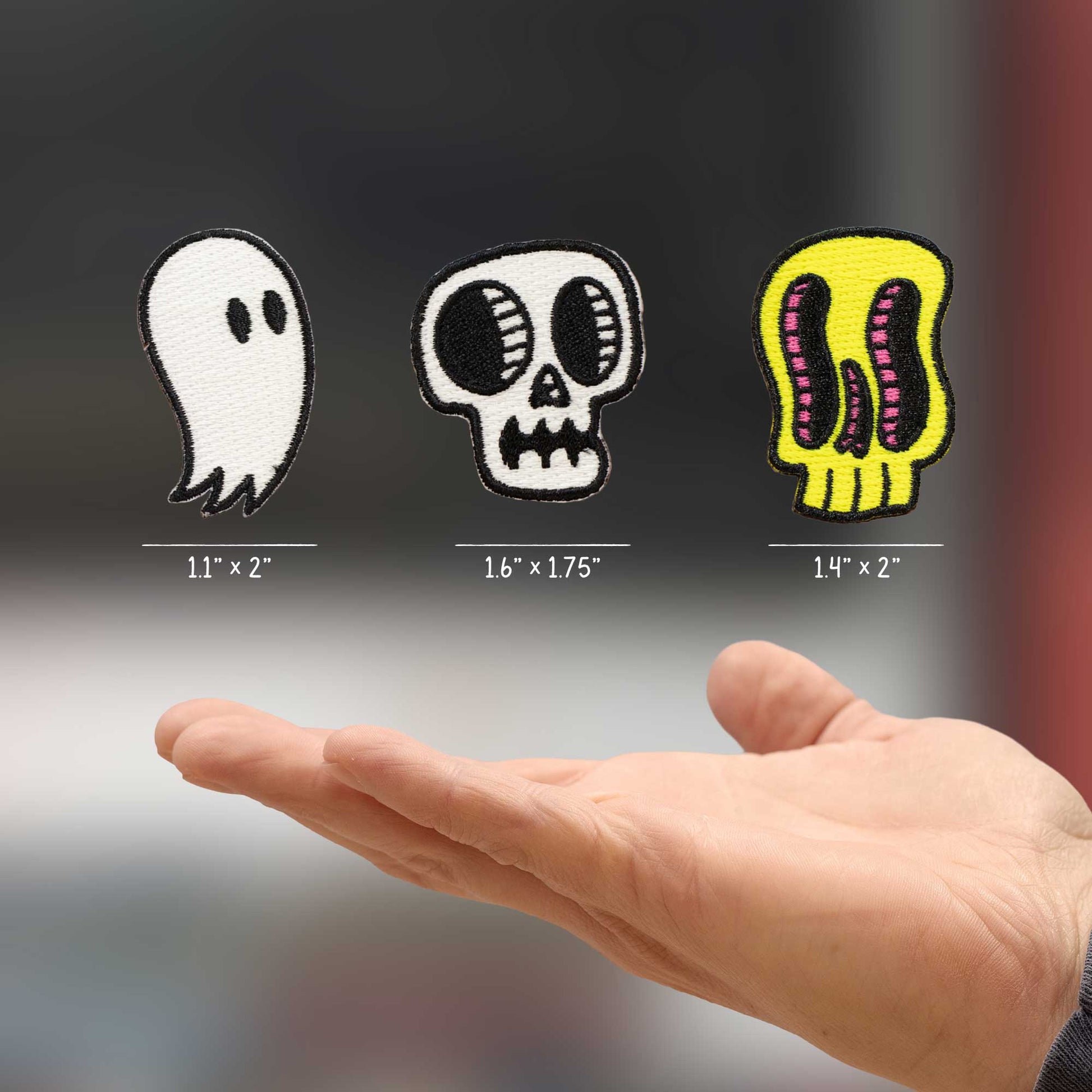 Add a touch of supernatural style to your favorite gear with this set of three glow-in-the-dark iron-on patches. Featuring a friendly ghost, a classic skull, and a unique wavy skull design, these small accents bring a playful, eerie vibe to any outfit. They are easy to apply and perfect for making sure your style stands out even after the lights go out.